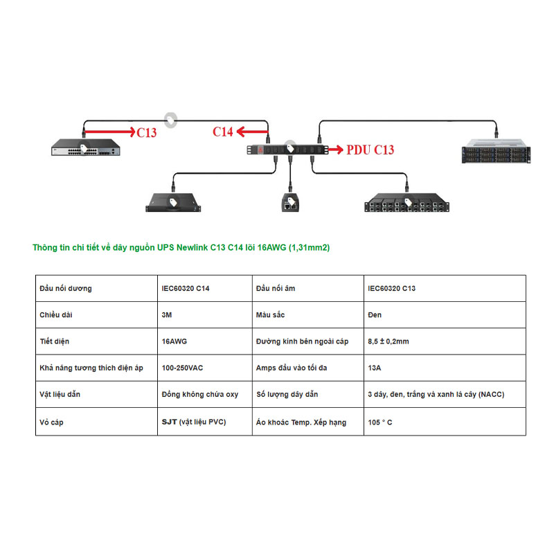 Dây Nguồn C13 C14 Dài 3M Tiết Diện Lõi Đồng 3x1.31mm2 16AWG LIAN DUNG 03004-332 Made In TAIWAN Dùng Cho PDU, UPS, Computer Power Cord.